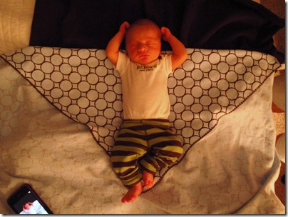 Excuse the awkward shot of Logan’s lap, but this guy sleeps like his Momma! Mouth wide open and hand over his head. He’s mine alright! Using our monthly onsie stickers – this one says “Just Born”. He’s so tiny in his rocker!